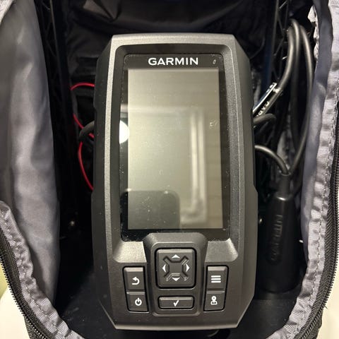 Garmin stiker 4, peräpeilianturi, akku, laukku.