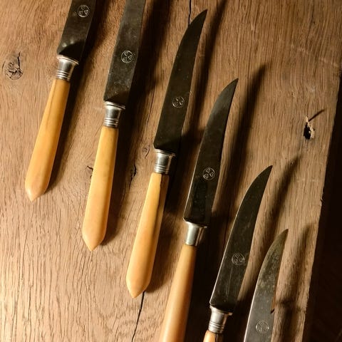 Ruokailuvälinesetti, johon kuuluu veitsiä ja haarukoita. Materiaalina on teräs tai muu metallinen materiaali. Sopii arki- ja juhlakäyttöön ruokailuun. Tarkempi määrä, malli ja valmistaja eivät käy ilmi kuvasta.