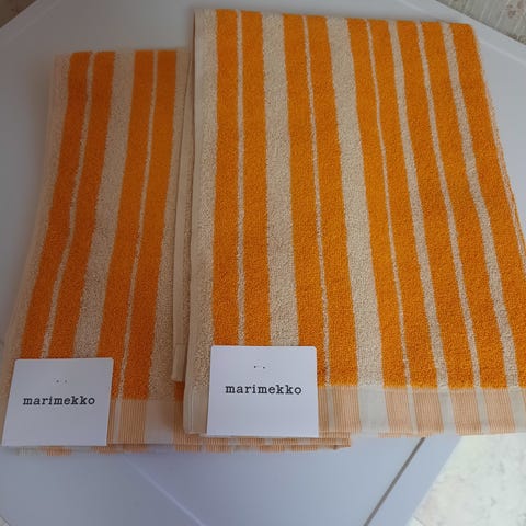 Marimekon uudet Tiiliskivi-vieraspyyhkeet 30x50 cm (2 kpl) ja yksi käsipyyhe 50x70 cm. Yhteishintaan 35e.