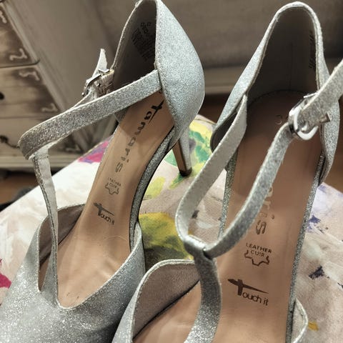 Päällinen on musta‑hopea seeprakuosi. Koristeltu hopeansävyisillä yksityiskohdilla. Nilkan ympärillä on säädettävä remmi. Sopivat juhla- ja iltakäyttöön.