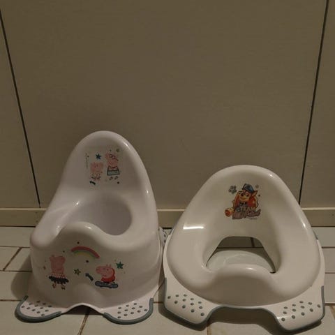 Annetaan vielä täysin kelpo kaksiosainen potta eteenpäin seuraavalle käyttäjälle. Muutama pieni kuluma, jotka ei vaikuta käyttöön mitenkään. Niistä lisäkuvat. Kestää varmaan vielä muutaman lapsen verran.