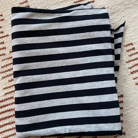Nosh musta trikoo kapeilla harmailla raidoilla. Raidat kudottu, joten värit eivät haalistu pesuissa. Laadukas puuvilla-elastaanineulos. Palan korkeus 115cm x leveys 95cm.