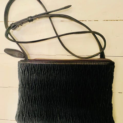 Musta käsilaukku / olkalaukku, joka materiaaliltaan on keinonahkaa. Kaksisuuntainen vetoketju ja kullanväriset metalliosat. Irrotettava ohut hihna, joka ei ole säädettävä. Sisällä vetoketjullinen tasku pikkutavaroille. Vähän käytetty.