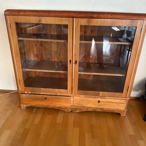 Vitriinikaappi, jossa on ruskeasta puusta valmistettu runko ja lasiset ovet sekä sivut. Kaapissa on useita lasihyllyjä esineiden esillepanoa varten. Alhaalla on kaareva vetolaatikko pientavaroiden säilytykseen.
