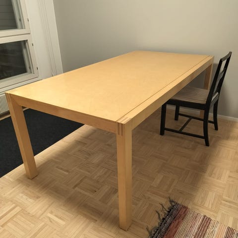 Myydään puinen pöytä. Käytönjälkiä reilusti, yleisilme kuitenkin kauempaa siisti. Mitat 118 cm x 74 cm.