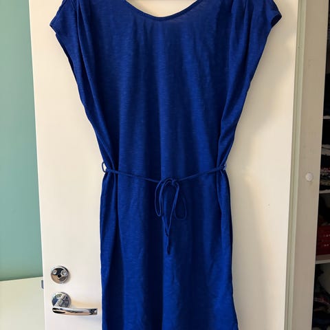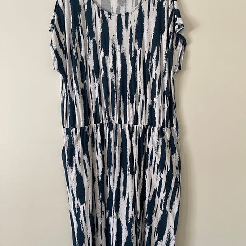 kesämekko naisille, koko L. Mekko on sinisävyinen kuviollinen ja valmistettu 100 % polyesteristä. Malli on väljä ja pitkä, helmassa on leveä röyhelö. Pääntiessä on halkio ja nauhakiinnitys tupsuilla. Lyhyet hihat. Sopii käytettäväksi esimerkiksi kesäkäytössä ja arkipukeutumisessa.