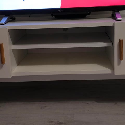 Valkoinen kaapisto, jossa ollut tv. Muuten hyvässä kunnossa, mutta kaapiston toisen puolen lasi hajonnut. Pitäisi hakea Lohjalta.