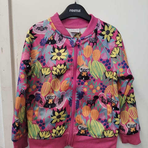 Muumi-verkkapuku kokoa 110. Ehjä, mutta polvissa ja takapuolessa kulumaa. Vaaleat kohdat varsinkin housuissa tummentuneet.