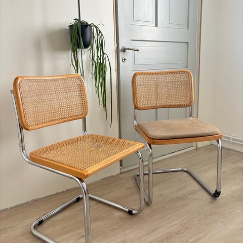 Erittäin hyvässä kunnossa. Parin tuolin jaloissa pientä kulumaa tai ruostetäpliä. Näistä kuvia ilmoituksessa ja lisää kuvia saa pyytämällä. Osassa kiinni alkuperäinen Made on Italy-tarra. Muutama jalkatappi hävinnyt, mutta näitä saa netistä eikä puuttuminen vaikuta tuolien käyttöön.