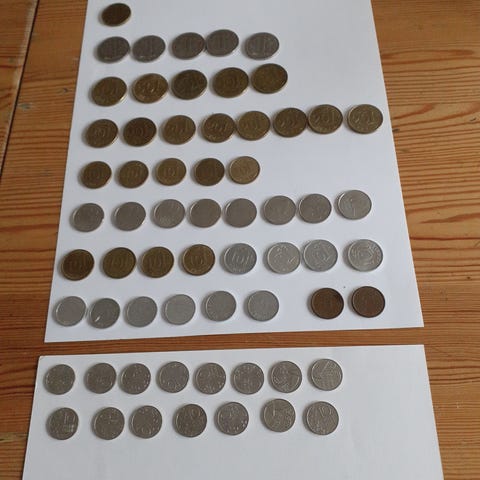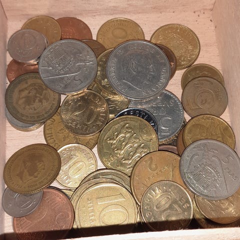 Sekalainen kolikkokokoelma. Kokoelmaan kuuluu eri kokoisia ja eri arvoisia metallisia kolikoita. Kolikot ovat eri väreissä, kuten kupari- ja hopeasävyissä. Soveltuu esimerkiksi keräilyyn, rekvisiittaan tai opetuskäyttöön.Kuvan kovat markka-ajan rahat kaikki yhteensä 10e