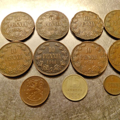 Sekalainen kolikkokokoelma suomalaisia markkoja ja pennejä