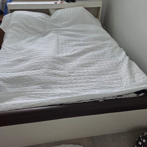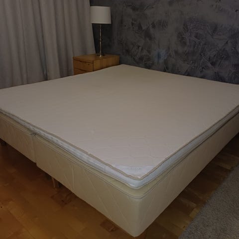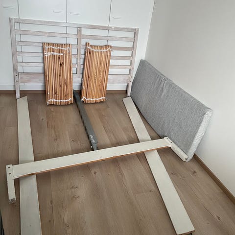Entinen vesisängyn pohja. Koivua luulisin. Siisti, ei mene ehkä ikinä rikki. Vaatii kyllä tilaa ja on liian iso nykyiseen asuntoon. Muut osat menee hissiin mutta pitkistä sivuista en uskalla luvata. Jäi sellainen käsitys, että Muuttofirma sai nekin hissiin survottua. Tarjous voimassa vuorokauden.