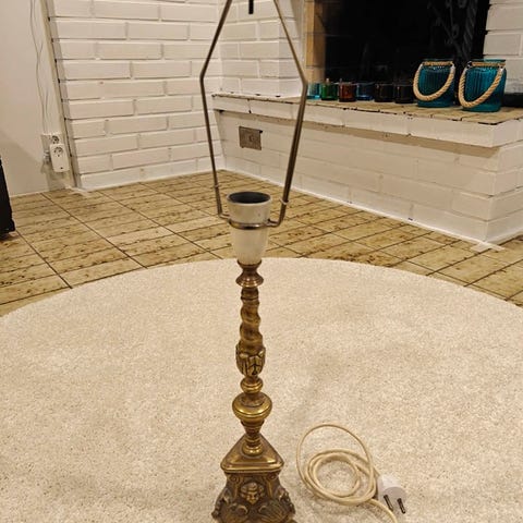 Vanha messinkinen pöytävalaisin, sähköt uusittu ja menee nykyaikaiseen maadotettuun pistorasiaan. Kupu vaihdettu. Valmistajasta tai vuodesta ei tietoa, kerro toki ihmeessä jos tiedät.