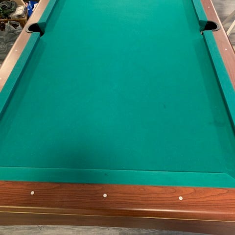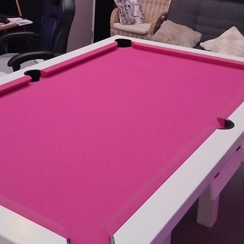 Biljardipöytä punaisella kankaalla ja varusteilla