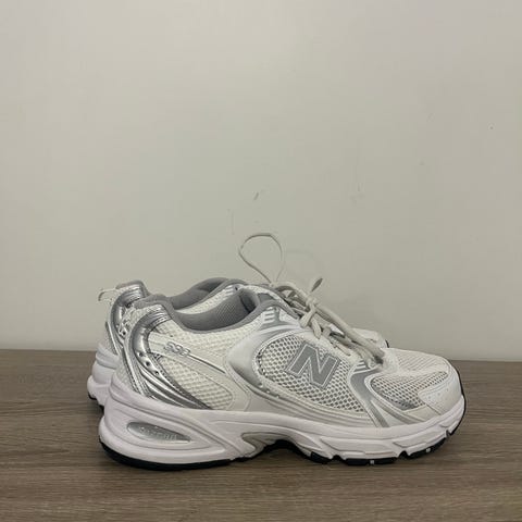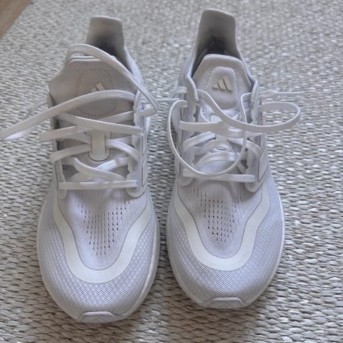 Adidas juoksukengät, koko 43. Väri vaalea, sivuilla tummat Adidas-raitat ja välipohjassa punaisen ja sinisen sävyjä. Päällinen verkkomaista tekstiiliä, joka on suunniteltu hengittäväksi. Välipohja paksu vaalea vaahtomateriaali, ulkopohjassa kumia paremman pidon vuoksi. Nauhakiinnitys. Soveltuvat juoksuun ja muuhun yleiseen liikuntaan.