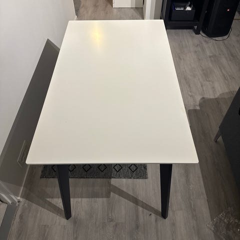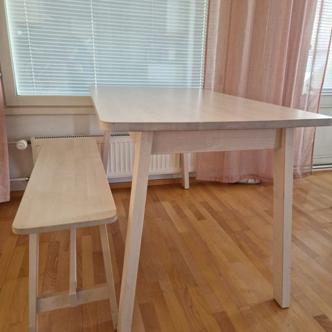 Pieni 4hengen ruokapöytä plus tuolit. Normaalia kulumaa pöydän kannessa. Pöytäliinalla piiloon