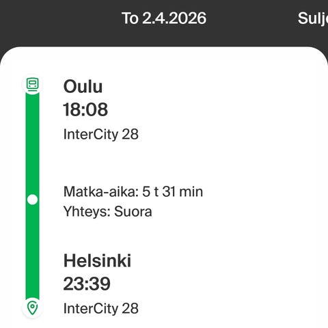 Myydään VR:n yöjuna Oulu–Helsinki 7.3. klo 20:55–06:27, 2 aikuiselle. Suora yhteys.