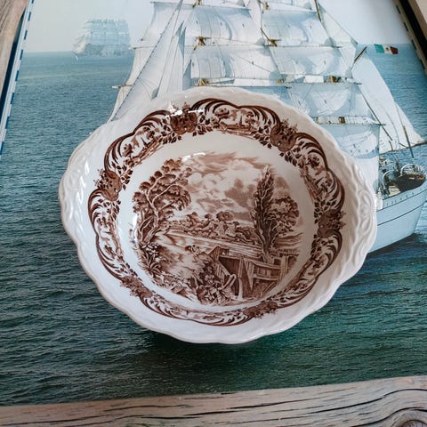 Myydään käytetyt hyvännäköiset W.H.Grindley & Coltd Staffordshire England lautanen ja kastikekulho. Lautanen on krakeloittunut molemmilta puolilta. Myös kastikekulhosta löytyy krakelointtia.