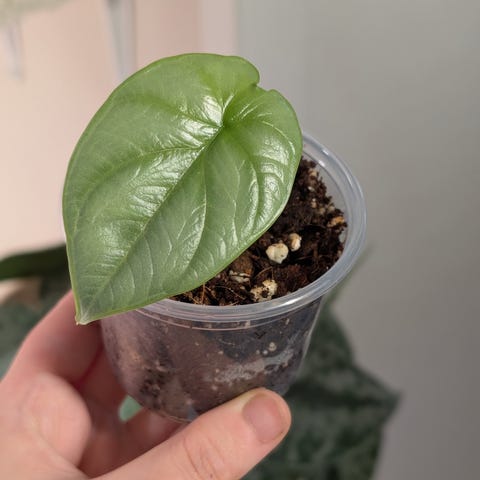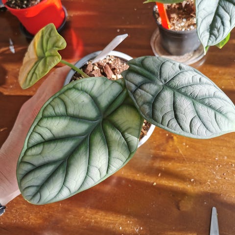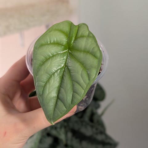 AlocasiaBlack velvet pink taimi hyvällä varilla. Kasvi myydään ruukussa, jossa on kasvualusta valmiina.