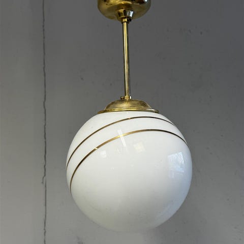 Kattovalaisin, jossa on kultainen runko ja valkoinen lasivarjostin kupu. Valaisimessa on kolme lamppua ja se on kiinnitetty ketjulla kattoon.