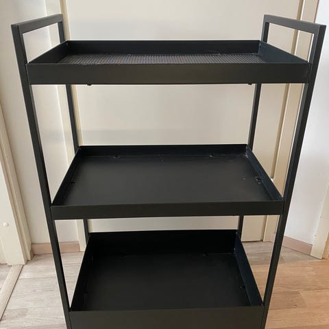 IKEA tarjoiluvaunu, musta metallinen. Vaunussa on kolme tasoa, joista alin on korimainen syvempi taso.