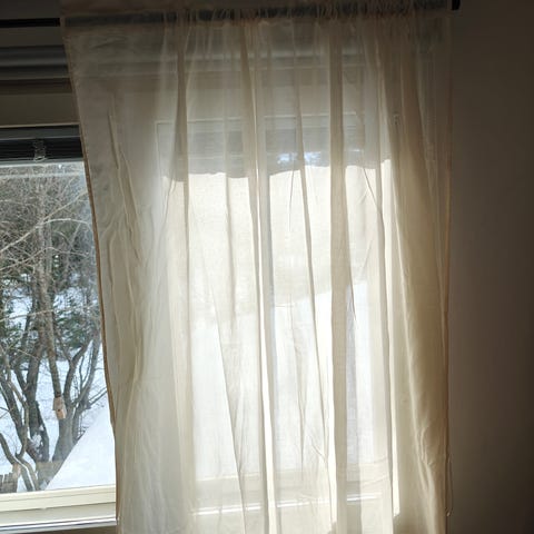 Alhaalla leveä 25cm käänne, jonka päällä 5 cm lev laskos. Käänne 25cm on jatke, kun tarvittiin pitkää verhoa. Rakenne on kaunis korkeassa ikkunassa. Ylhäällä on rypytysnauha, mutta käytimme laskostaen nipsurenkaita. Puhtaat, ehyet…. Kankaan pinta elävää, kun langat kankaassa ovat eri vahvuisia. 2 verhoa yht 20 ja toimitus