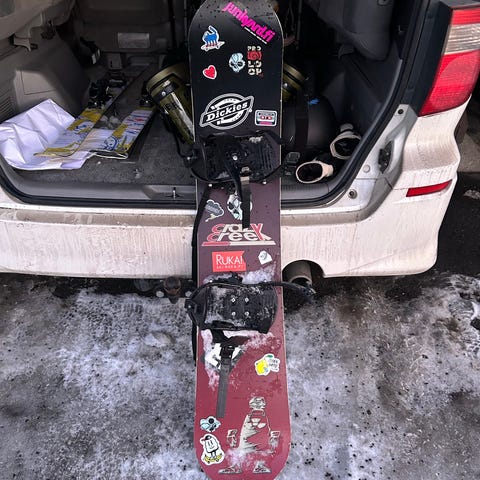 Kohtuullisessa kunnossa oleva lauta. Pohjassa joitain paikattuja uurteita ja kärjestä pari palaa pinnasta pois.