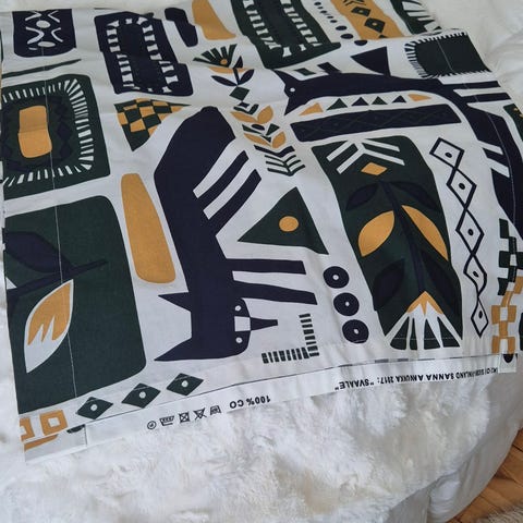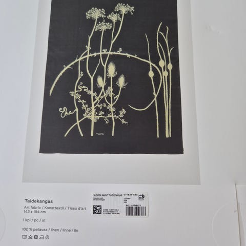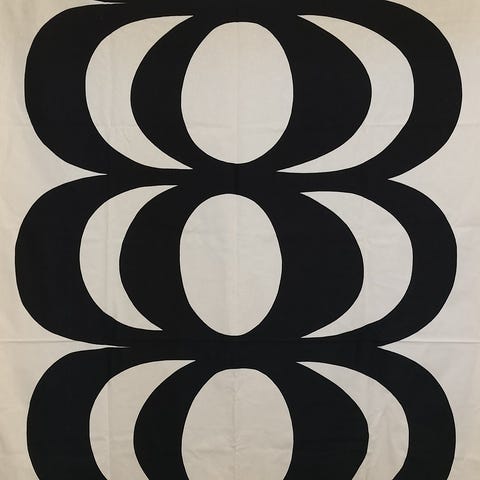 Marimekko Heta -kangas 140 cm lev ja 240 pitkä. Päädyt päärmätty, sivut ei. Sopii sellaisenaan esim. pöytäliinaksi tai tehosteverhoksi.