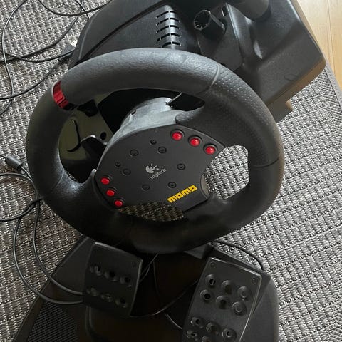 Logitechin ratti ja polkimet. Vähän käytetty. Koira söi johdot poikki, näkyy kuvassa. Eli muuntajan johto poikki ja polkimista rattiin menevä johto poikki.