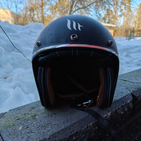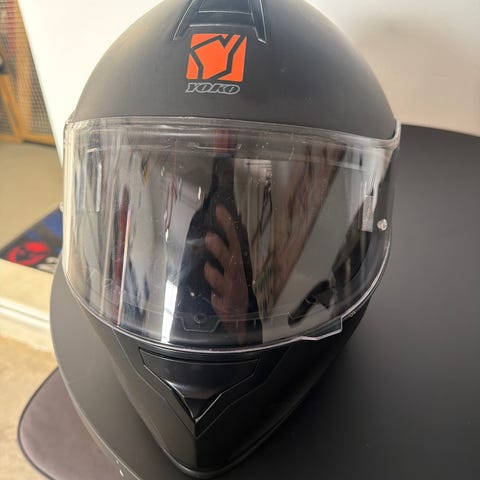 YOKO umpikypärä moottoripyörä- tai mopokäyttöön. Koko M (57–58 cm), paino noin 1400 g. Väritys harmaa/musta digicamo-kuvioinnilla ja vaaleilla yksityiskohdilla. Kypärässä on peili ulkolippa sekä tumma sisäinen aurinkovisiiri. Mukaan myös kirkas visiiri.
