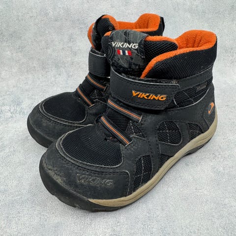 Hyväkuntoiset Vikingin välikausikengät. Kaikinpuolin oikein siistit, vain pohjissa kulumaa kärjissä sekä kantapään kohdalla, ei vaikuta käyttöön. Tarrat pitää erinomaisesti ja kengät on testattu juoksevan veden alla vedenpitäviksi.