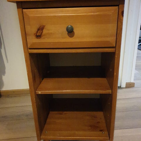 Yöpöydän virkaa toimittanut kaksitasoinen pöytä. Korkeus 56cm, leveys 55 ja syvyys 45. Kannessa muutama jälki mutta yleisilme siisti.