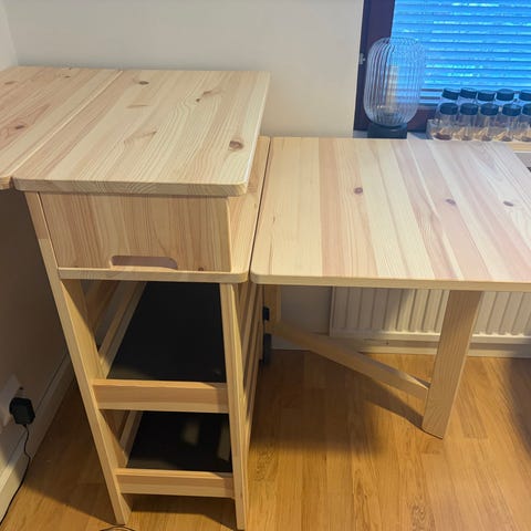 Mäntypuinen kaksiosainen, tukeva pieni klaffipöytä.
