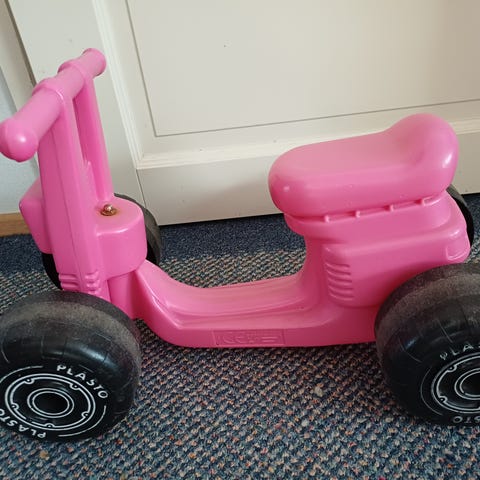 Pinkki plasto potkumopo. Ollut meillä vain sisäkäytössä. Savuton ja eläimetön koti.