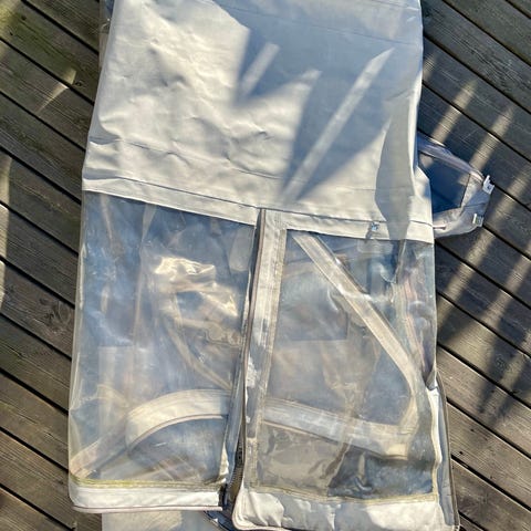 Uudenveroinen peräkuomu Buster LX -16 veneeseen. Mukana kuomukangas, kaaret ja suojapussi. Ei sis. oviverhoa.