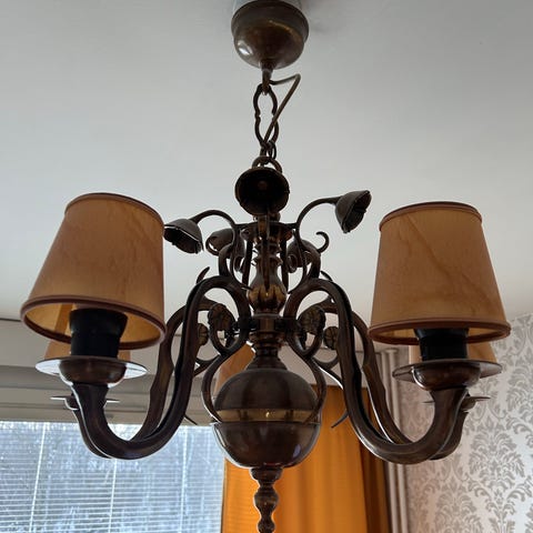 Tyylikäs 60-luvun kattokruunu myytävänä. Kunto hyvä. Lasikuvut ehjät. Toiminta testattu. Halkaisija noin 52 cm ja korkeus 75 cm.