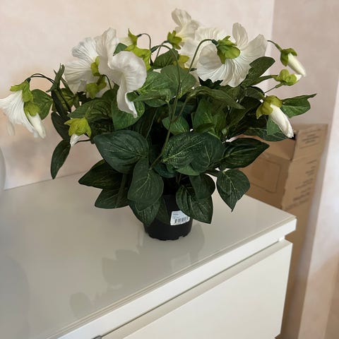 Amppelissa roikkuva tekokukka. Pölyt jää ostajalle pyyhittäväksi. Paavolasta nouto