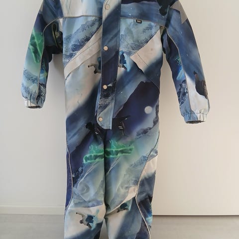 Molo haalari, koko 110. Väri musta. Materiaali polyesteriä. Haalarissa on huppu, edessä vetoketju ja painonapit sekä heijastinyksityiskohtia hihoissa ja lahkeissa. Ehjä, mutta käytön jälkiä.