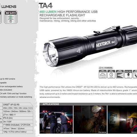 Taktinen pitkä taskulamppu. Tarjoaa 300 lumenin ulkovalaistuksen. Ladattava.