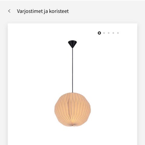 Valaisimen mukana tulee viimeisessä kuvassa näkyvät tarvikkeet. Lisäksi mukana tulee aloituskuvassa näkyvä kuvun päällä oleva musta osa. Huom! Aloituskuvan katon rajassa oleva suojakupu ei kuulu kauppaan. Lampun oma suojakupu on vähän erilainen.