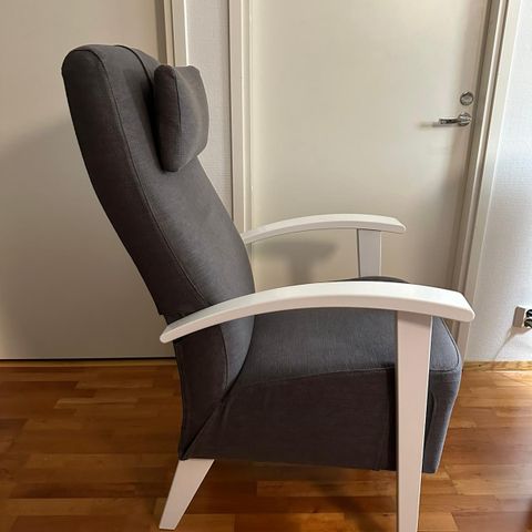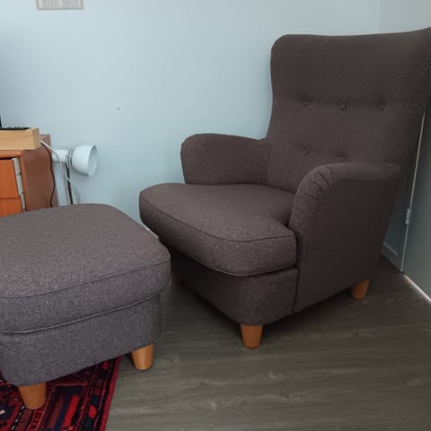 Omset Amanda nojatuoli ja rahi, verhoiltu harmaalla kankaalla. Nojatuolissa on korkea selkänoja ja erillinen niskatyyny. Käsinojat ja jalat ovat vaaleaa puuta. Rahi on samaa harmaata kangasta ja siinä on puujalat. Sopii olohuoneeseen tai luku- ja lepohetkiin istuimena ja jalkojen lepuuttamiseen. Ostettu Kaluste Heinosilta Elokuussa 2025 hintaan 930€