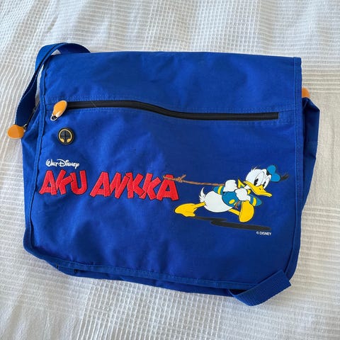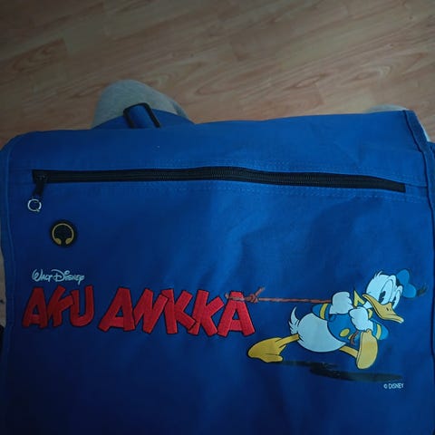 Aku Ankka-lehdistä (tukevasta materiaalista) punottu käsilaukku. Muovikahvat. Käsityötä, laadukas ja ehjä. Noin 25x25 x 8cm.