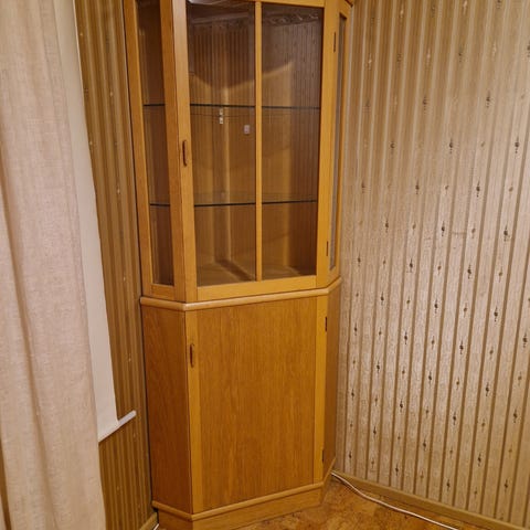 Vitriinissä lasitasot ja takaseinässä peili.