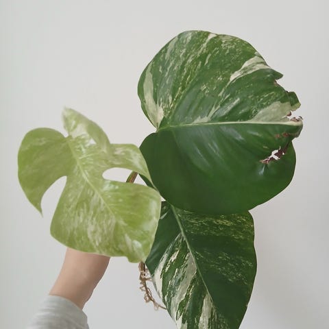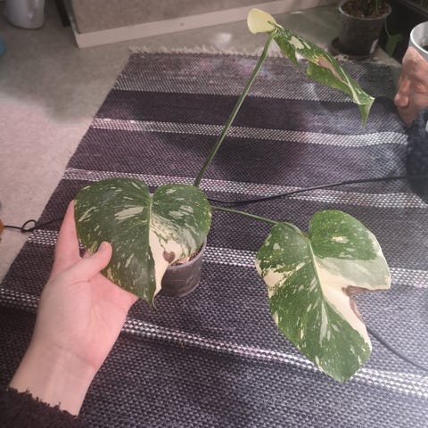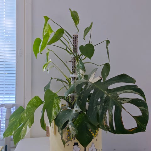 Monstera variegata -huonekasvi, jossa vihreä-valkoiset kirjavat lehdet. Kasvi on istutettu ruukkuun ja soveltuu sisätiloihin. Lehdet ovat suuria ja liuskoittuneita, ja kasvilla on useita versoja. Sopii koristekasviksi esimerkiksi olohuoneeseen tai muihin valoisaan, mutta suoralta auringolta suojattuun tilaan. Kasvi tarvitsee säännöllistä kastelua ja läpäisevän kasvualustan. Ruukku tulee mukaan… kasvi vaatii tilaa on aika iso. Uusia lehtiä tulossa runsaasti.muutamassa lehdessä mekaanista vauriota.