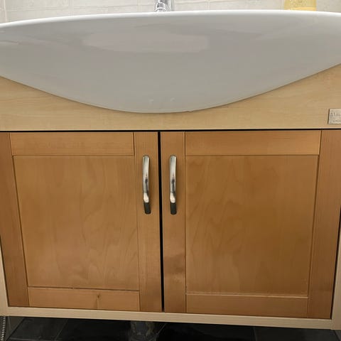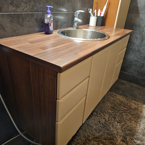 Allaskaappi purettu varastointia varten, ei ole asennettu lainkaan kylpyhuoneeseen. Laatikoiden korkeakiiltoisissa harmaissa levyissa on naarmuja ja koloja. Harmat levyt voi päällystää esim. D-C-Fix tai vaihtaa. Melaniinilevyssä halkeamaa puutappireiän ympärillä, mutta jää piiloon allaskaapin kokoamisen jälkeen.