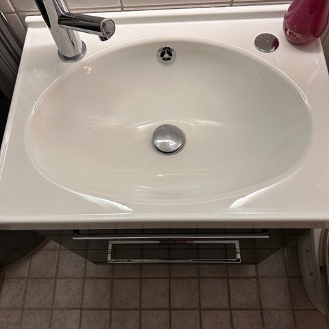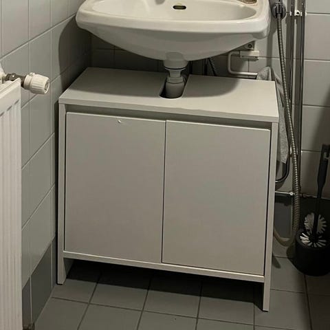 Käyttämätön kylpyhuoneen allaskaappi ja pesuallas. Kokonaisuuteen kuuluu keraaminen pesuallas hanareiällä ja ylivuotoaukolla sekä seinään kiinnitettävä allaskaappi kahdella harmaalla etusarjalla varustetulla laatikolla. Ylälaatikko on kahdessa osassa viemäriputkea varten. Laatikoissa on metallin väriset vetimet. Mukana tulevat kaapin rungon ja etusarjojen levyt, laatikostojen osat, kiskot sekä kokoamisohjeet. Soveltuu seinään asennettavaksi allaskokonaisuudeksi.