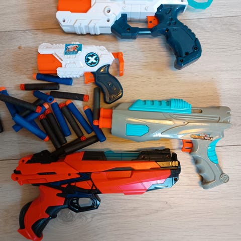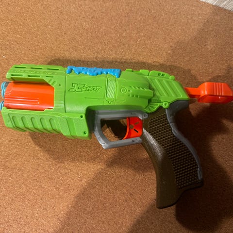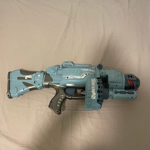 Tek Recon Hammer Head ase, mikä ampuu pieniä kumisia renkaita, joita mukana 32 kpl. Panokset ladataan aseen lippaseen, lippaaseen mahtuu 25 panosta. Panosten säilytystä varten mukana säilytyskapseli. Postitus tai nouto Nokialta, satunnaisesti kulkeutuu Tampereen keskustaan.