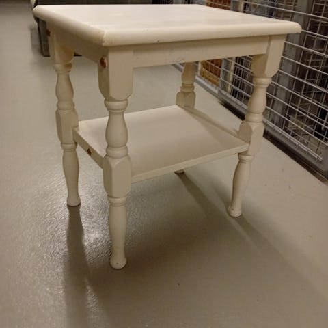 Valkoinen sivupöytä, harmailla lokerikoilla. Muutoin siisti ja ehjä, mutta päälitason etureunassa on kulumaa (näkyy viimeisessä kuvassa). Mitat: 80x37z30cm