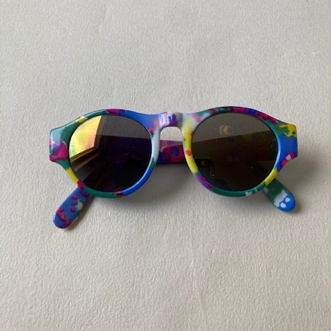 Laadukkaat aurinkolasit lapselle. Pilotti-mallista muotoilua, mutta kuitenkin perinteiset. Ruusukultaiset joustosangat. Leveys 11,5 cm. Inspiro-merkkiset. Pidetty todella hyvin. Mukaan saa silmälasikotelon.