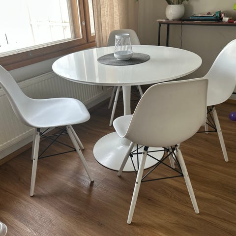 Kalusteet ovat siistit ja tukevat, normaalia käytön jälkeä voi olla. Sopii hyvin keittiöön tai ruokailutilaan.